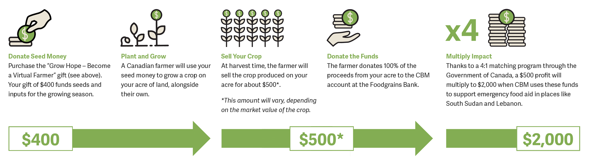 Your gift will not only fund the costs for supplies such as seeds, fertilizer, crop spraying and associated equipment costs, but it will also grow hope and change the lives of people in need far away from where it was grown.